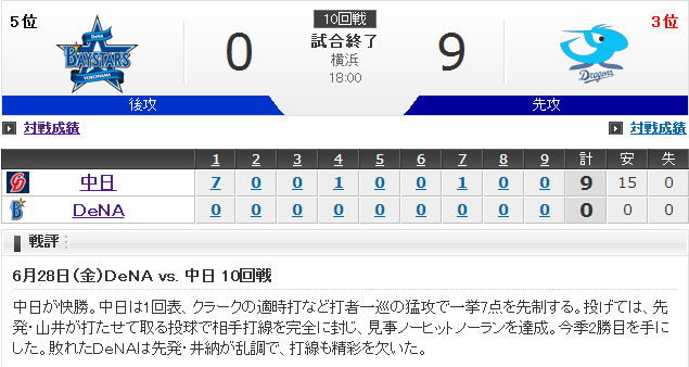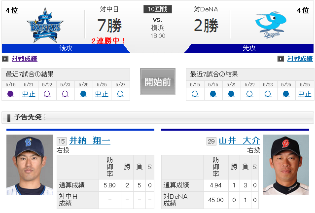 DeNA・井納 vs 中日・山井 in横浜スタジアムwwwwwww